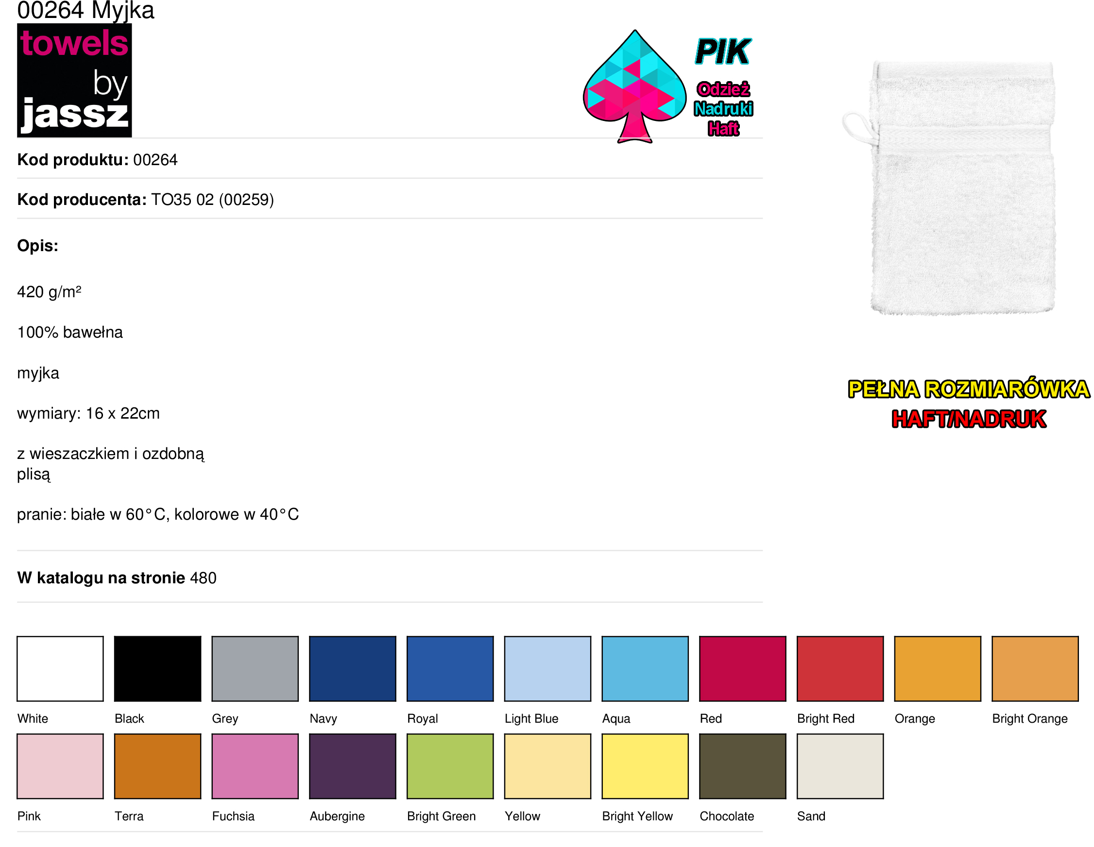 - Kod produktu: Myjka bawełniana, różne kolory HAFT/NADRUK